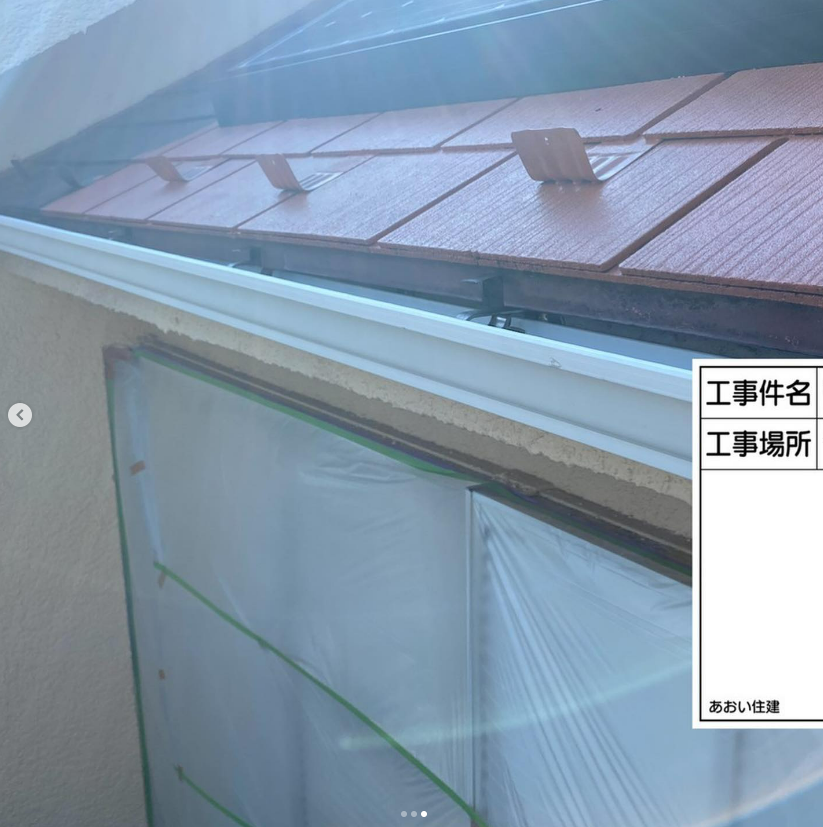 コロニアル(スレート)の上に防水シートを貼ります。防水シートは下葺き材ともよばれ、雨漏りを防いでくれる重要な役目があります。